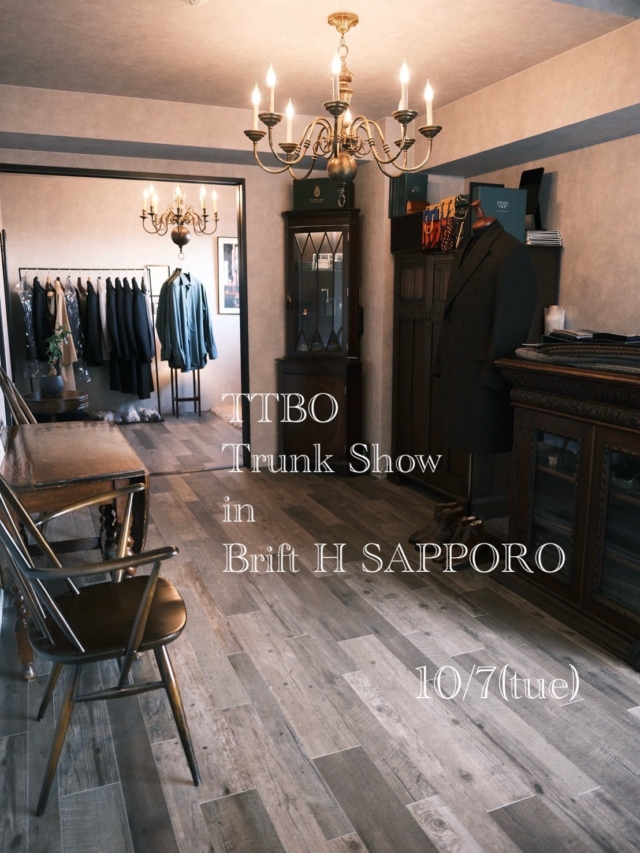 TTBO初の北海道地区でのトランクショーをBrift H SAPPOROにて開催いたします。今回は特殊な事情とBrift H SAPPOROの林田さんのご厚意で、トランクショーの実現に至りましたので、これ以降の開催予定は未定です。平日開催につきお忙しいかと存じますが、北海道にお住まいの皆様はご都合がつけばぜひお越しくださいませ。見学だけでも大歓迎です。当日はお馴染みaldexの工場次長である岩田規史さんと共に、当店の代表商品であるTTBOSUITや新作TTBOCOATを始め、シャツやメガネ等、他では手に入れることの出来ない当店限定モデルを多数お持ちいたします。予約サイトの備考欄に、ご覧になりたいアイテムをご記入いただきましたら、確実にお見せ出来るよう準備いたします。
